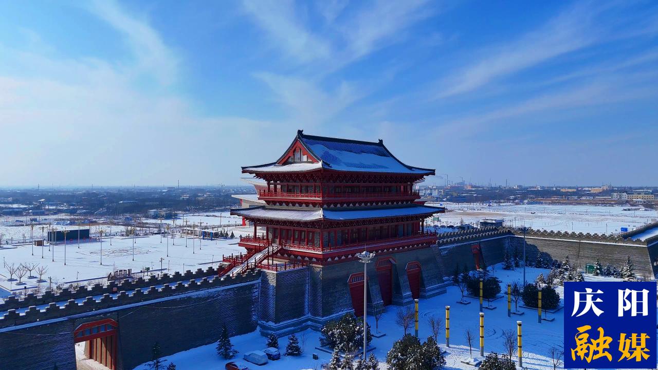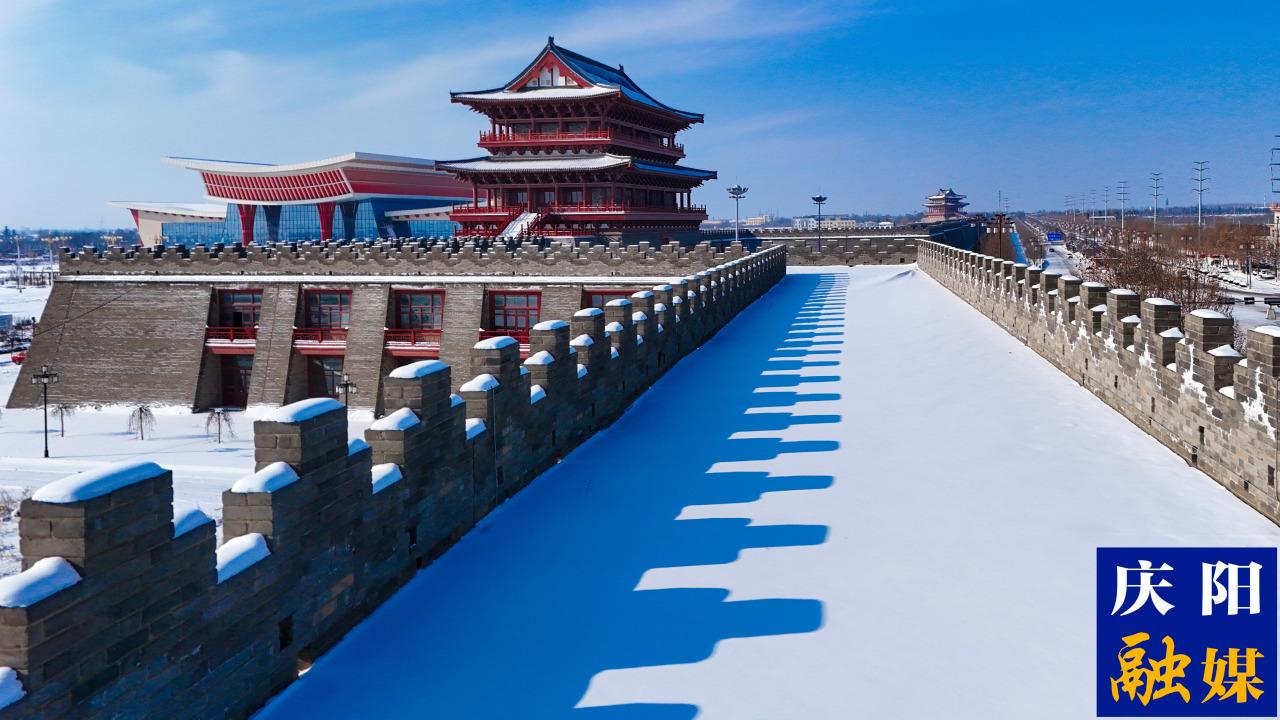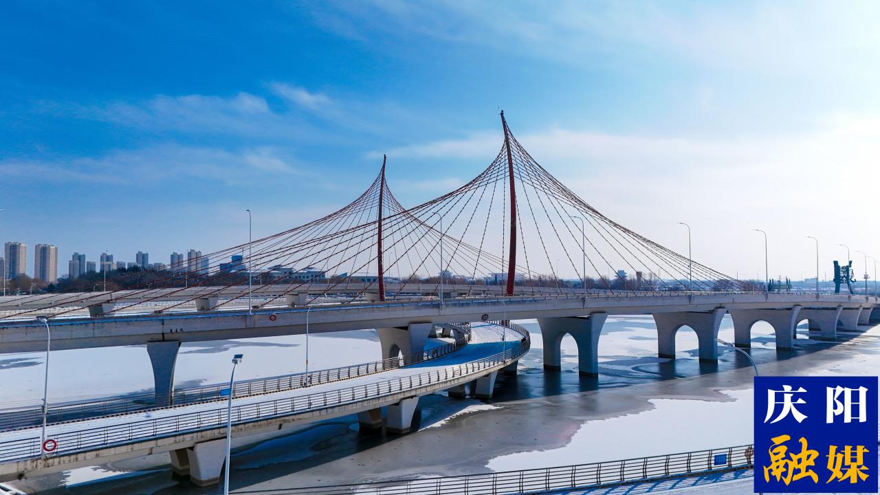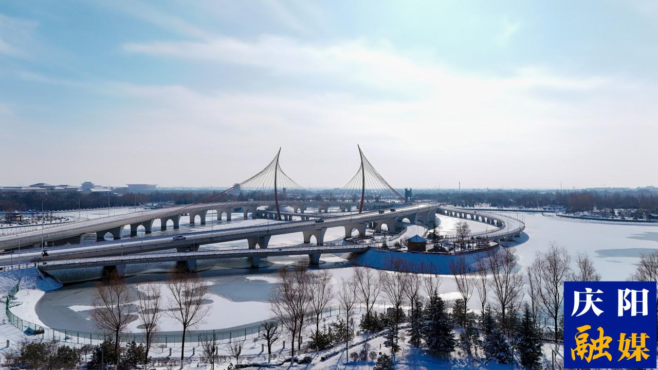 彩虹橋的橋身橫跨冰封的水面,利落的線條在晴光下勾勒出城市交通的靈動脈絡(luò);隴東風情園的仿古建筑紅墻飛檐覆雪而立,古典韻味在冰雪映襯中愈發(fā)醇厚?,F(xiàn)代建筑的蓬勃生機與傳統(tǒng)建筑的雅致底蘊在此交融,晴雪為媒,讓慶陽的城市風貌既有著時代發(fā)展的鮮活節(jié)奏,又留存著古韻悠悠的獨特氣質(zhì)。