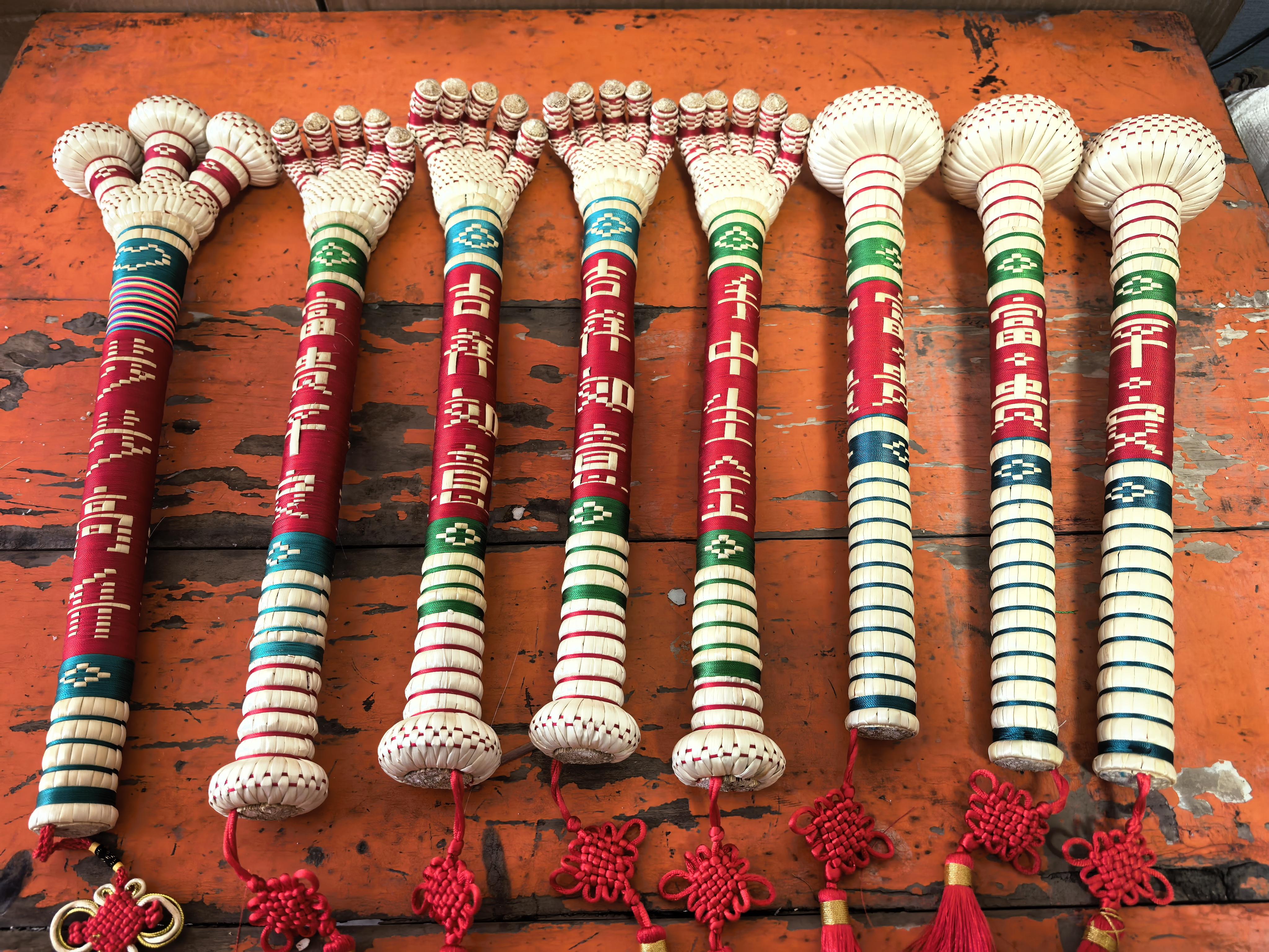 回到環(huán)縣后,李相玉開始了他的“笤帚革命”。他不再滿足于傳統(tǒng)的實用笤帚,而是嘗試將民俗文化元素融入創(chuàng)作:用彩線在把手上編織“福”“囍”“吉”等吉祥字樣;開發(fā)出保健捶、癢癢撓、按摩棒等健康養(yǎng)生產(chǎn)品。