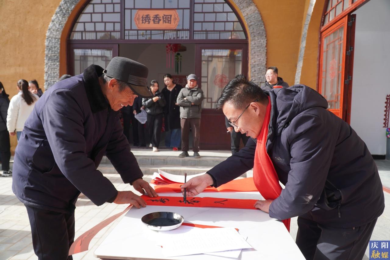 日頭漸高,暖意愈濃。帶著臘八的香甜與溫馨,村民們?nèi)齼蓛呻x席。有的圍在傳統(tǒng)剪紙藝人身邊細細觀摩,有的排隊等待領(lǐng)取心儀的春聯(lián)?!敖瘃R迎春春入戶,祥風(fēng)報喜喜臨門”“馬年好運隨春到,家業(yè)興旺逐日升”……墨香四溢間,村民們接過紅彤彤的春聯(lián),小心翼翼卷好,笑容里滿載著對新年的憧憬。