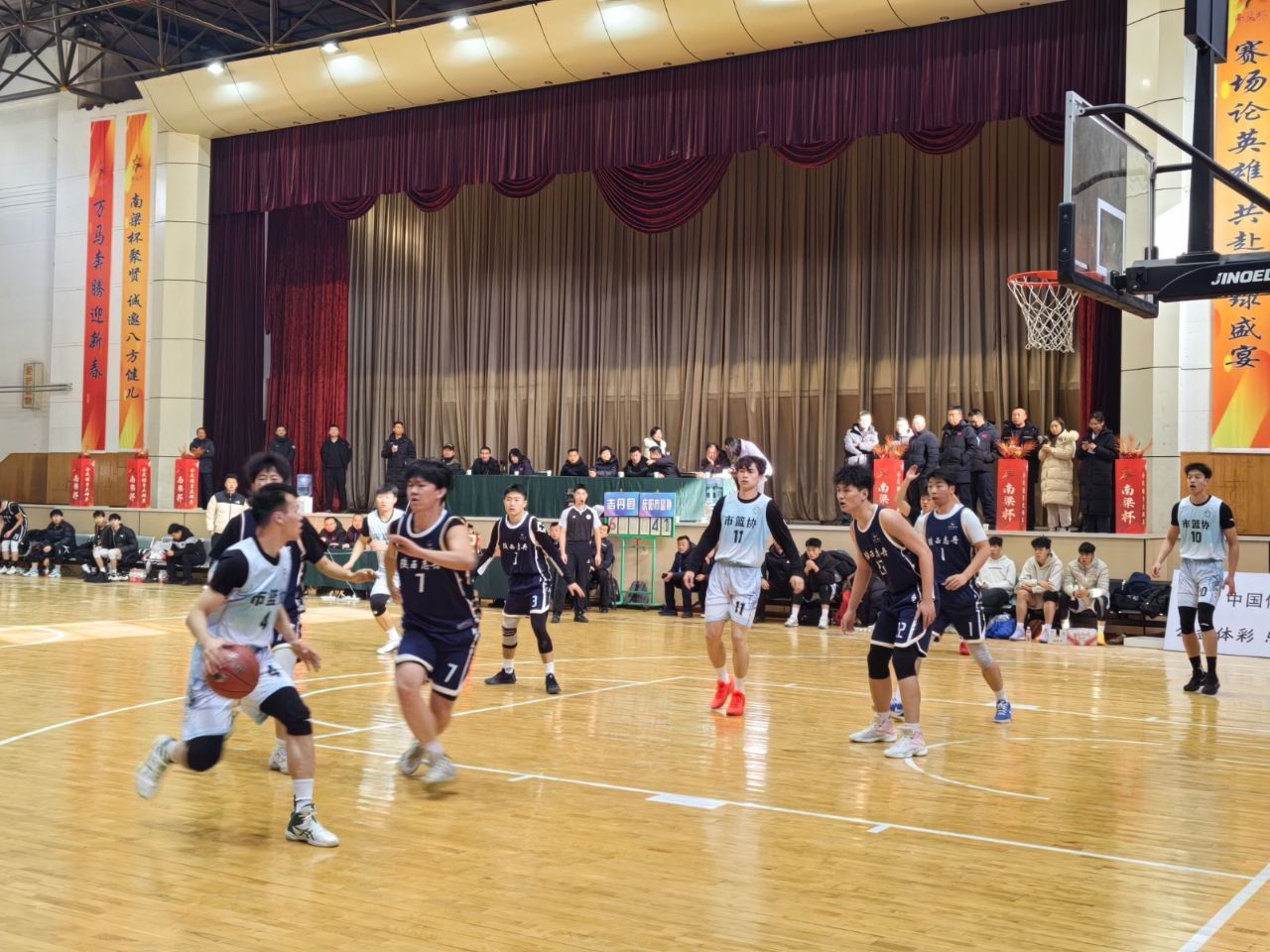 隨著裁判一聲清脆的哨響,開(kāi)幕式后的首場(chǎng)比賽在志丹縣代表隊(duì)與市籃協(xié)代表隊(duì)之間激烈打響。賽場(chǎng)之上,球員們迅速進(jìn)入狀態(tài),傳球、起跳、投籃,一系列動(dòng)作行云流水;進(jìn)攻時(shí)默契配合,防守時(shí)嚴(yán)密布防,每一次精彩得分都引來(lái)現(xiàn)場(chǎng)歡呼,賽場(chǎng)內(nèi)外洋溢著熱烈的競(jìng)技氛圍。