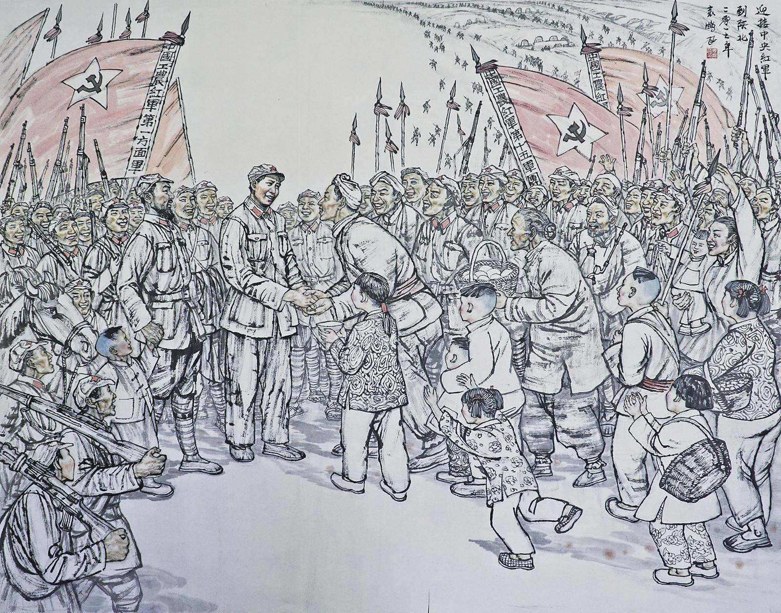 二、三縱隊(duì)因?yàn)闆]有敵人的麻煩,行進(jìn)很迅速,當(dāng)天全部趕到鐵角城附近宿營。這一帶的群眾受陜北紅軍的影響很深,所以非常積極地幫助我們。青壯年幫助我們買糧食,買菜買羊,婦女幫助燒火煮飯,小孩子帶路挑水,我們也照例請群眾代表吃飯。第二天清早走十多里路,就到鐵角城。這里,總共才有十多戶人家。離開鐵角城又開始上山。我們從山上望見,追擊我左邊一縱隊(duì)的敵騎兵也正在運(yùn)動,一縱隊(duì)休息,敵人也休息。敵人看到前面是紅軍,右邊又是紅軍,大概也會感到很不舒服吧。我們在途中休息的時(shí)候,遇到了陜北紅軍派來給毛主席送信的人。毛主席看過信,站在山頂上,向正在休息的部隊(duì)大聲喊道:“同志們!我們就要到達(dá)陜北根據(jù)地了!我們的紅二十五軍和紅二十六軍派人來接我們了!……”主席的話還沒講完,山坡上立刻歡騰起來,同志們高興地笑著、跳著,互相擁抱著、歡呼著,有些同志激動得面掛熱淚飛奔。