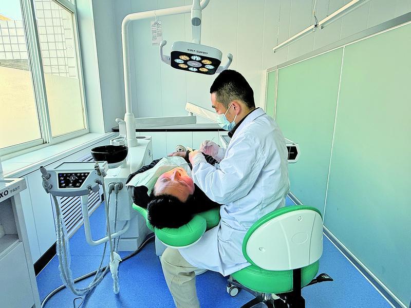正寧縣湫頭鎮(zhèn)中心衛(wèi)生院口腔科醫(yī)生為患者檢查牙齒。
