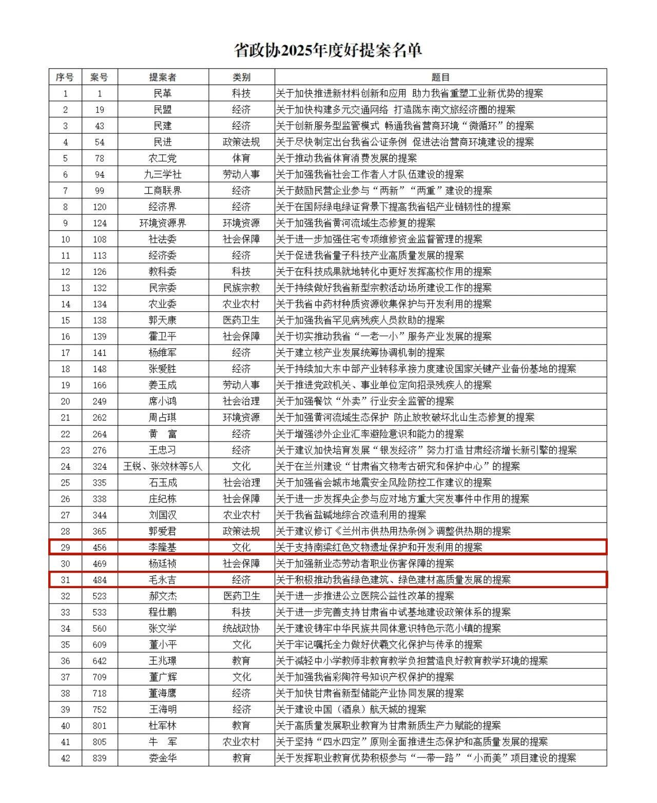 為進(jìn)一步提高提案工作的質(zhì)量和實(shí)效,根據(jù)《中國(guó)人民政治協(xié)商會(huì)議甘肅省委員會(huì)提案工作條例》和《政協(xié)甘肅省委員會(huì)年度好提案通報(bào)表?yè)P(yáng)實(shí)施辦法(試行)》,經(jīng)政協(xié)甘肅省第十三屆委員會(huì)第四十一次主席會(huì)議審議通過(guò),現(xiàn)對(duì)《關(guān)于加快推進(jìn)新材料創(chuàng)新和應(yīng)用 助力我省重塑工業(yè)新優(yōu)勢(shì)的提案》等42件省政協(xié)2025年度好提案予以通報(bào)表?yè)P(yáng)。