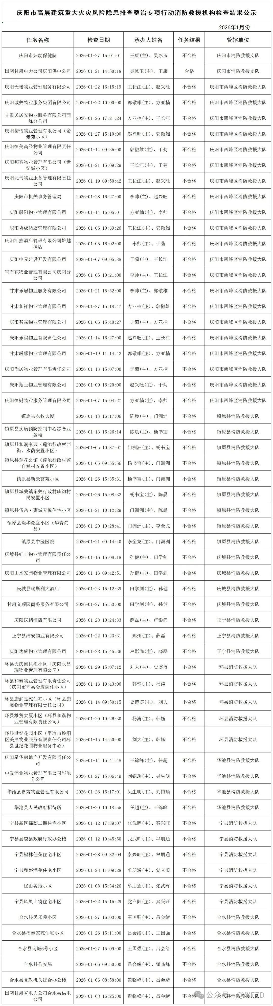 為貫徹落實國務院安委會和省、市安委會關于開展高層建筑重大火災風險隱患排查整治專項行動的部署,現(xiàn)將慶陽市高層建筑重大火災風險隱患排查整治專項行動消防救援機構1月份檢查結果和2月份檢查計劃公示如下: