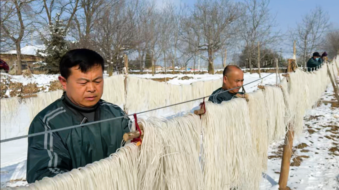 隆冬時節(jié),鄢旗坳村“老孫家”粉坊內(nèi)白霧氤氳。村民們正將本地的馬鈴薯,經(jīng)由一雙雙巧手,化為根根瑩潤的粉條——蒸氣繚繞間,流轉的是綿延百年的手藝,也是當下鄉(xiāng)親們紅火日子的盼頭。老師傅手腕輕轉,淀粉漿如銀絲般滑入滾水,瞬間便凝成透亮柔韌的粉條。出鍋的粉條經(jīng)冷水一“激”,瞬間鎖住筋道,隨后被掛上長桿,移入院中。冰天雪地的晴空下,萬千粉條如銀瀑垂懸,隨風輕搖,空氣里滿溢著糧食與陽光交融的厚樸醇香。