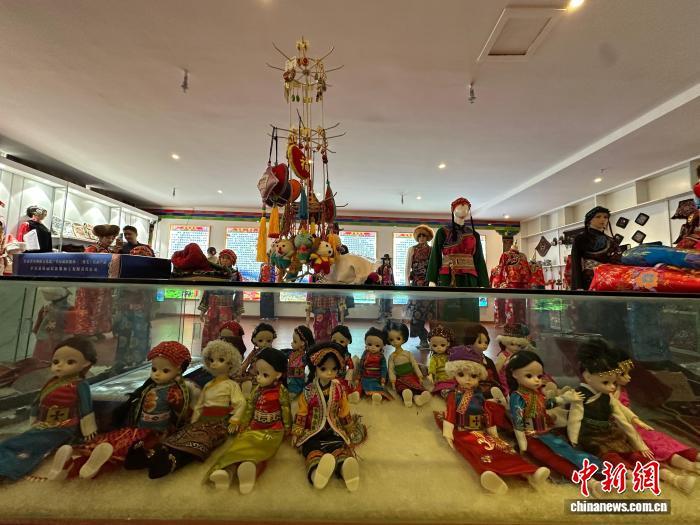 2月1日,殷保朝工作室里展陳的承載著“三格毛”服飾文化的布偶和掛件伴手等文創(chuàng)新品。中新社記者馮志軍攝
