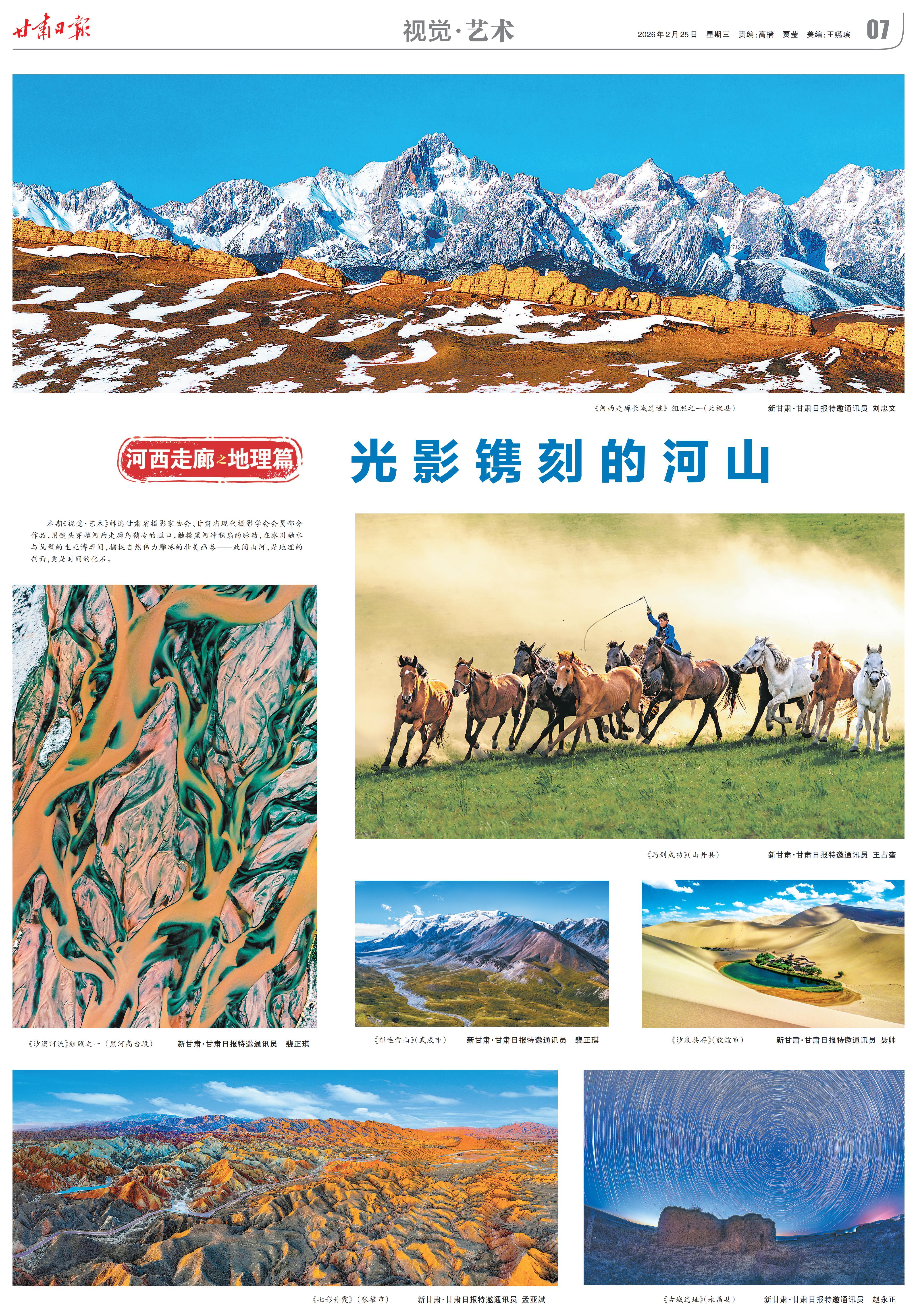 本期《視覺(jué)·藝術(shù)》輯選甘肅省攝影家協(xié)會(huì)、甘肅省現(xiàn)代攝影學(xué)會(huì)會(huì)員部分作品,用鏡頭穿越河西走廊烏鞘嶺的隘口,觸摸黑河沖積扇的脈動(dòng),在冰川融水與戈壁的生死博弈間,捕捉自然偉力雕琢的壯美畫(huà)卷——此間山河,是地理的剖面,更是時(shí)間的化石。新甘肅·甘肅日?qǐng)?bào)記者 高檣組稿