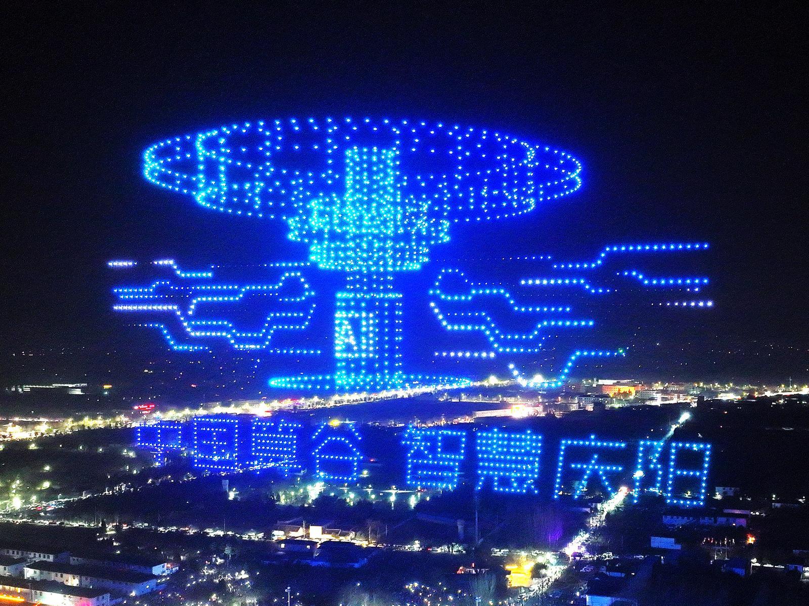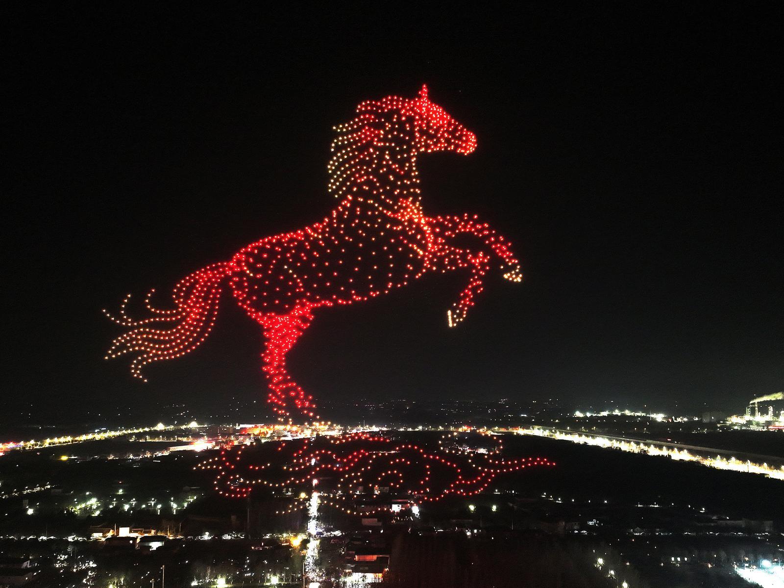 祥瑞余韻未盡,科技浪潮奔涌而來。緊接著,2000架無人機同步升空,化作漫天星光,在夜幕中匯聚成巨型光影矩陣,依次呈現(xiàn)9組主題畫面,將慶陽的歷史文脈、產(chǎn)業(yè)實力、科創(chuàng)活力與城市騰飛愿景,一一清晰鋪展在蒼穹之上。